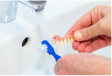 · หลังรับประทานอาหารให้ทำความสะอาดฟันปลอม โดยใช้แปรงสำหรับฟันปลอมหรือแปรงสีฟันขนนุ่ม ร่วมกับการใช้น้ำสบู่แล้วล้างออกด้วยน้ำสะอาด
